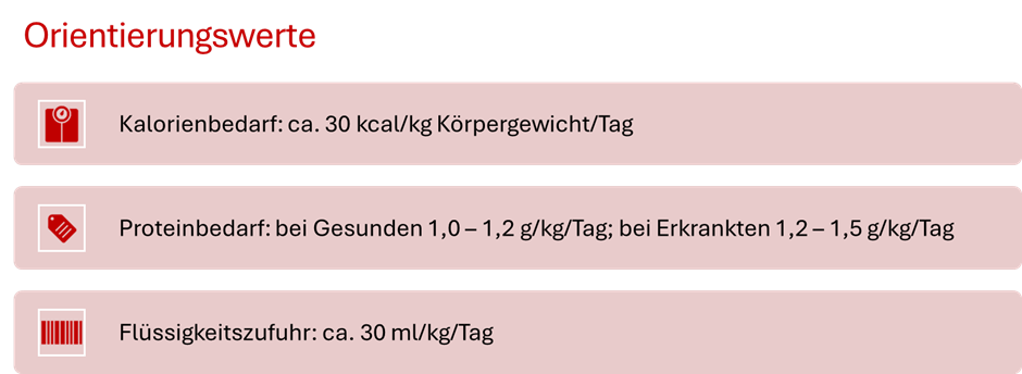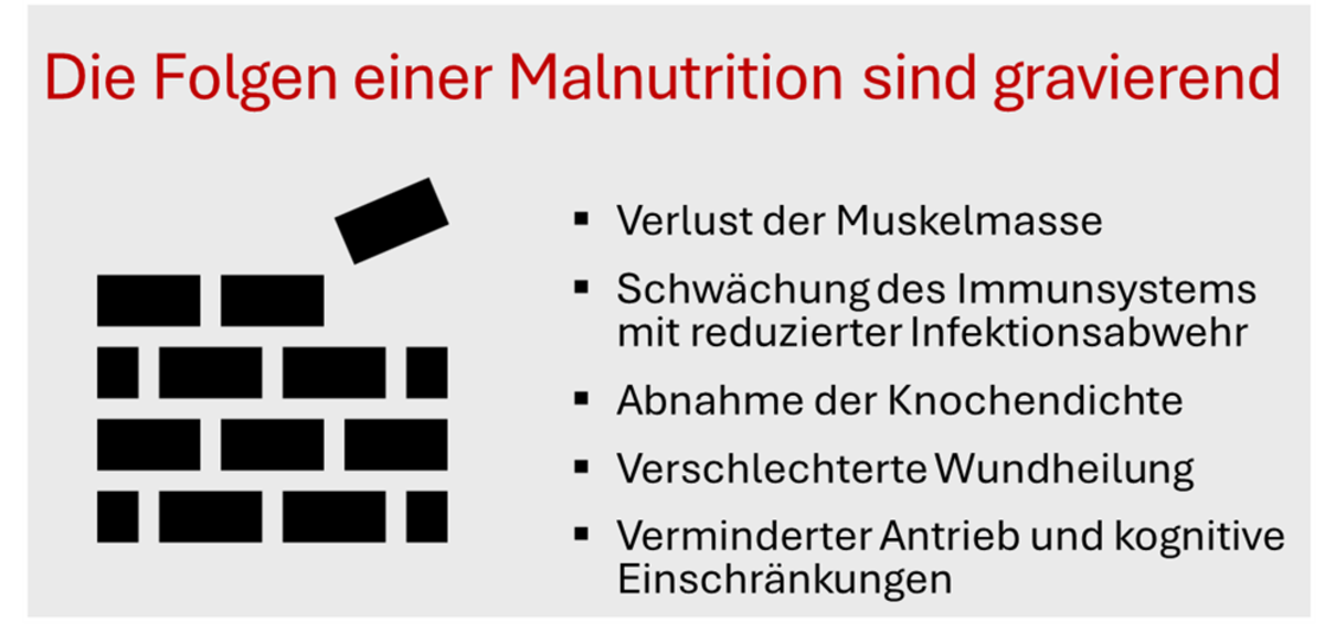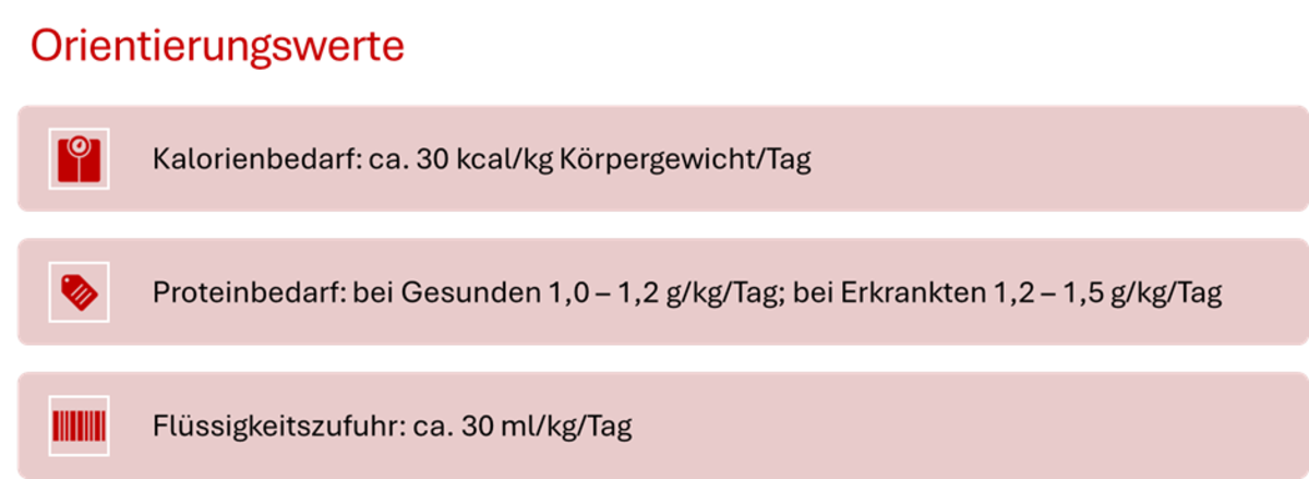 Beim Refeeding-Syndrom (RFS) handelt es sich um eine potenziell lebensbedrohliche Stoffwechselentgleisung, die bei zu schneller Nahrungsgabe in zu großen Mengen nach 2-5 Tagen auftreten kann. Die Symptomatik kann sehr unspezifisch sein. Als typische Symptome werden in der S3-Leitlinie Muskelschwäche, Desorientiertheit und periphere Ödeme benannt (DGEM, 2025:60). Daher ist ein schrittweiser Aufbau der Kalorienzufuhr unter Berücksichtigung der Verträglichkeit entscheidend.