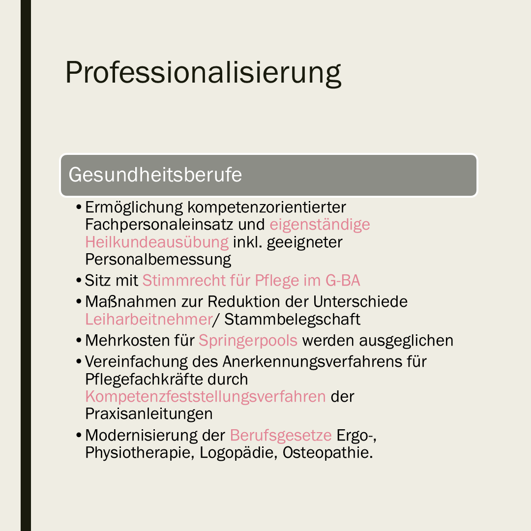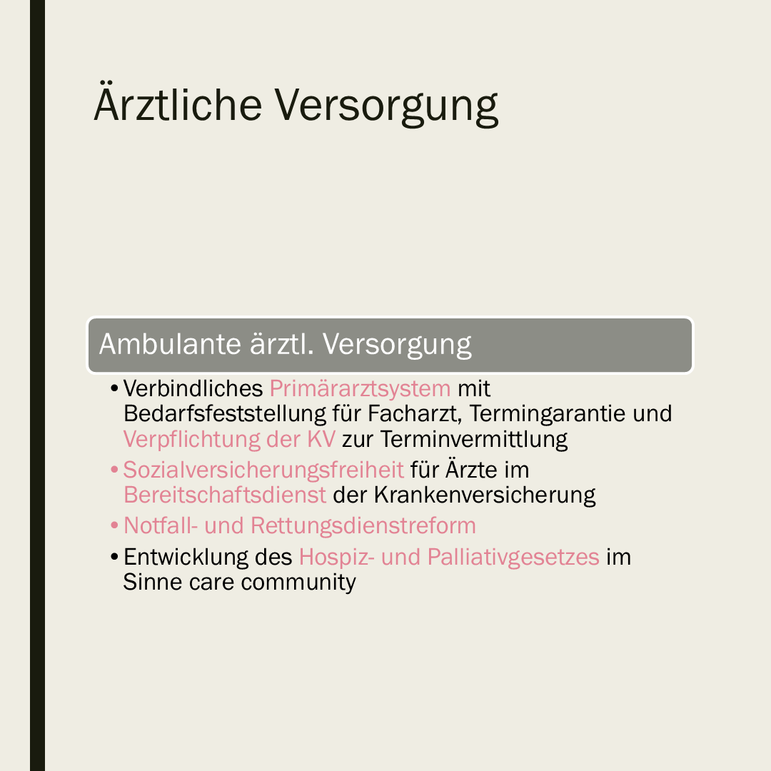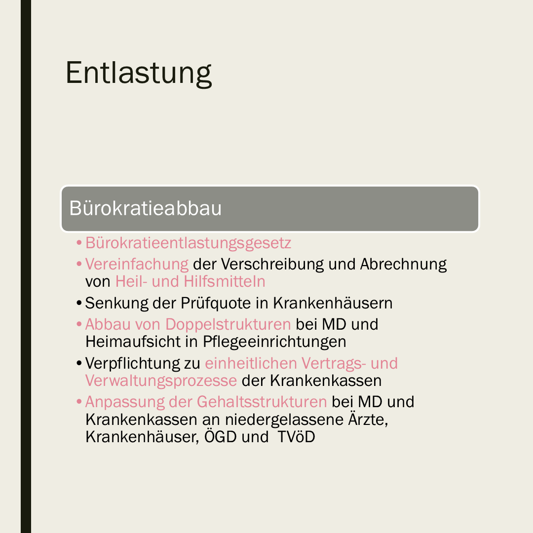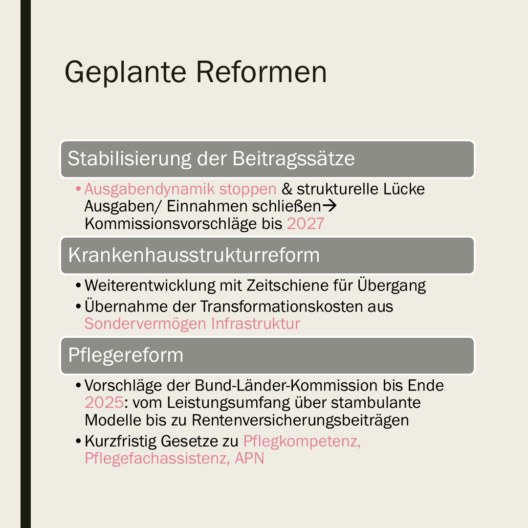 Es bleibt spannend! Viele gute Ansätze, die in der letzten Legislatur aufgrund der Neuwahlen nicht fertig geworden sind, werden nun zu Ende gebracht. Andere Ansätze wie die Krankenhausstrukturreform werden fortgeführt bzw. weiterentwickelt. Die große Problemlösung einer nachhaltigen Finanzierung bleibt ein Überraschungspaket. Ende 2025 dürfen wir mit konkreten Vorschlägen für die Pflegeversicherung rechnen, in 2027 sollten dann zumindest Lösungsansätze für die Krankenversicherung vorliegen. Der Grundtenor lautet Kosten und Einnahmen in Einklang bringen. Die aktuellen Rahmenbedingungen deuten darauf hin, dass sich die Einnahmen nicht umfassend und schnell steigern lassen. Es wird also vermutlich an der Kostenseite geschraubt werden müssen. Da auch die Löhne aufgrund des Personalmangels nicht nach unten korrigiert werden können, wird man über die Leistungen der Kranken- und Pflegeversicherung nachdenken. Das angeführte Primärarztsystem kann bereits ein Hinweis sein, wie zukünftig die Inanspruchnahme von Leistungen gesteuert werden soll. Der Personalqualifikationsmix und die verstärkte Einbindung von Ehrenamt im Sinne sorgender Gemeinschaften scheint ebenfalls attraktiv zu sein.